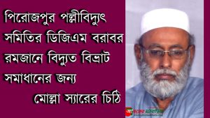 উপরিউক্ত বিষয়ে অপনাকে বিনয়ের সাথে জানানো যাচ্ছে যে, পবিত্র রমজান মাসে নামাজ,ইফতার ও সেহরির সময়ে লোডশেডিং দিবেন না।উল্লেখিত সময়ে লোডশেডিং দেয়া অপরাধমূলক কাজ। লোডশেডিং দিতে হলে দিন বা গভীর রাতে দেয়া যেতে পারে। তবে এক ঘন্টার বেশী নয়। আপনার সংস্হা জনগণের নিকট শোষণকারী হিসেবে পরিচিত। আপনার সংস্হা নানা ভাবে জনগণকে শোষণ করতেছে। অতিরিক্ত লোডশেডিং এবং শোষণ বন্ধ করুন। নামাজ,ইফতার ও সেহরির সময়ে লোডশেডিং এবং অতিরিক্ত বিল